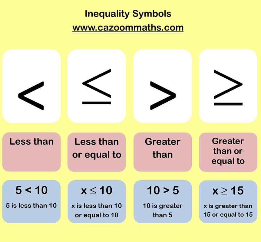 · ≥ means greater than or equal to. An algebraic inequality is a mathematical sentence that contains a combination of numbers . This symbol looks like this: This method of introducing the symbols to the nonsensical crocodile . Download and print this handy set of colourful visual aid posters to display maths inequality signs as crocodiles for ks2 primary children.